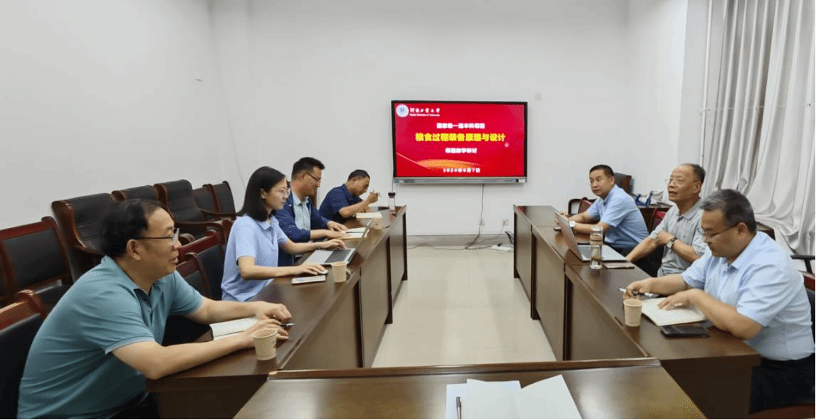 在7336会议室召开国家级一流本科课程建设规划研讨会。教育部机械类专业教学指导委员会委员胡继云、副院长郭永刚、粮油工程及装备系主任王明旭、教学办公室主任王彦林和学院骨干教师参会。