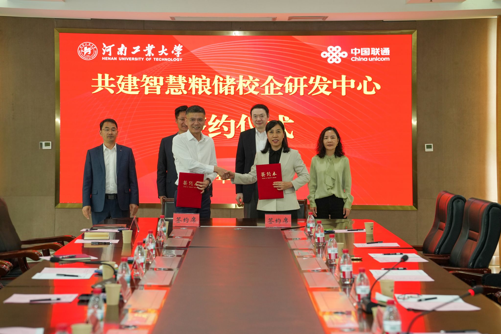 与中国联通郑州市分公司共建“智慧粮储校企研发中心”签约仪式在学术报告中心D203会议室举行。校长吴智深、副校长白艳红,以及校长办公室、科技处、产业技术研究院、信息化办公室、韩国h漫