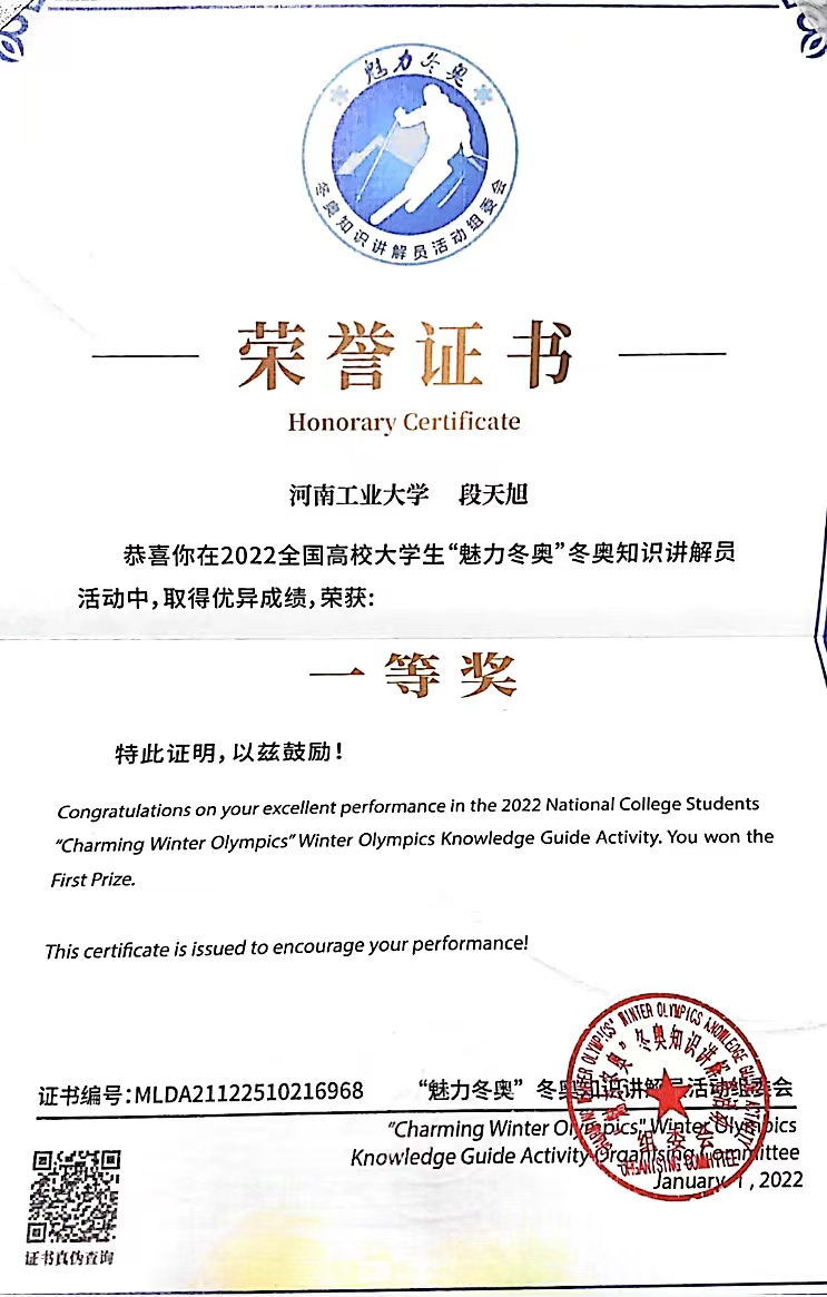 21级机械专业研究生段天旭获得一等奖荣誉证书。