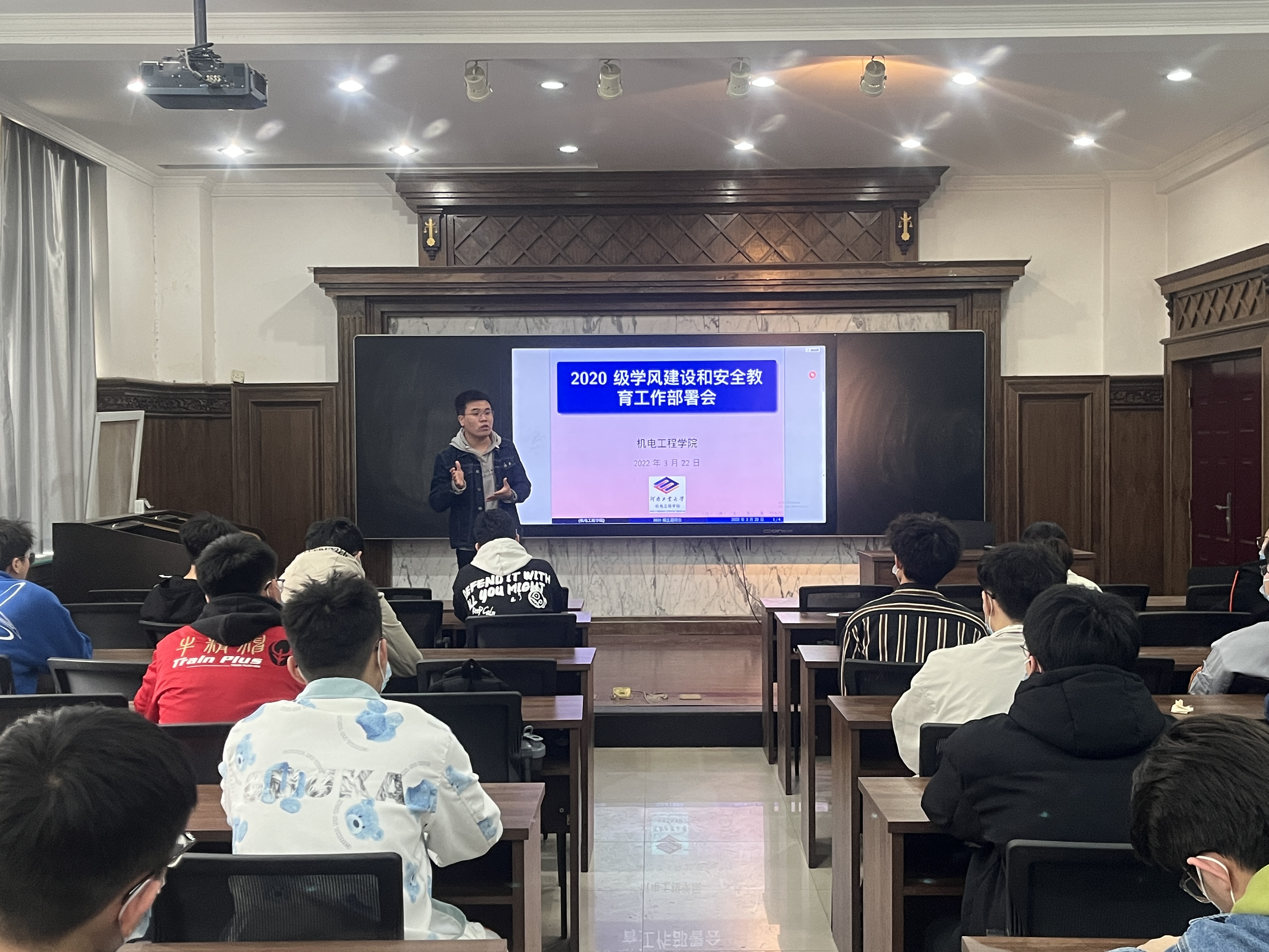 2020级学风建设和安全教育工作部署会。学工办副主任刘伟杰、导师班主任代表常永、学院研究生张柏、还有校退伍大学生鞠跃龙以及韩国h漫