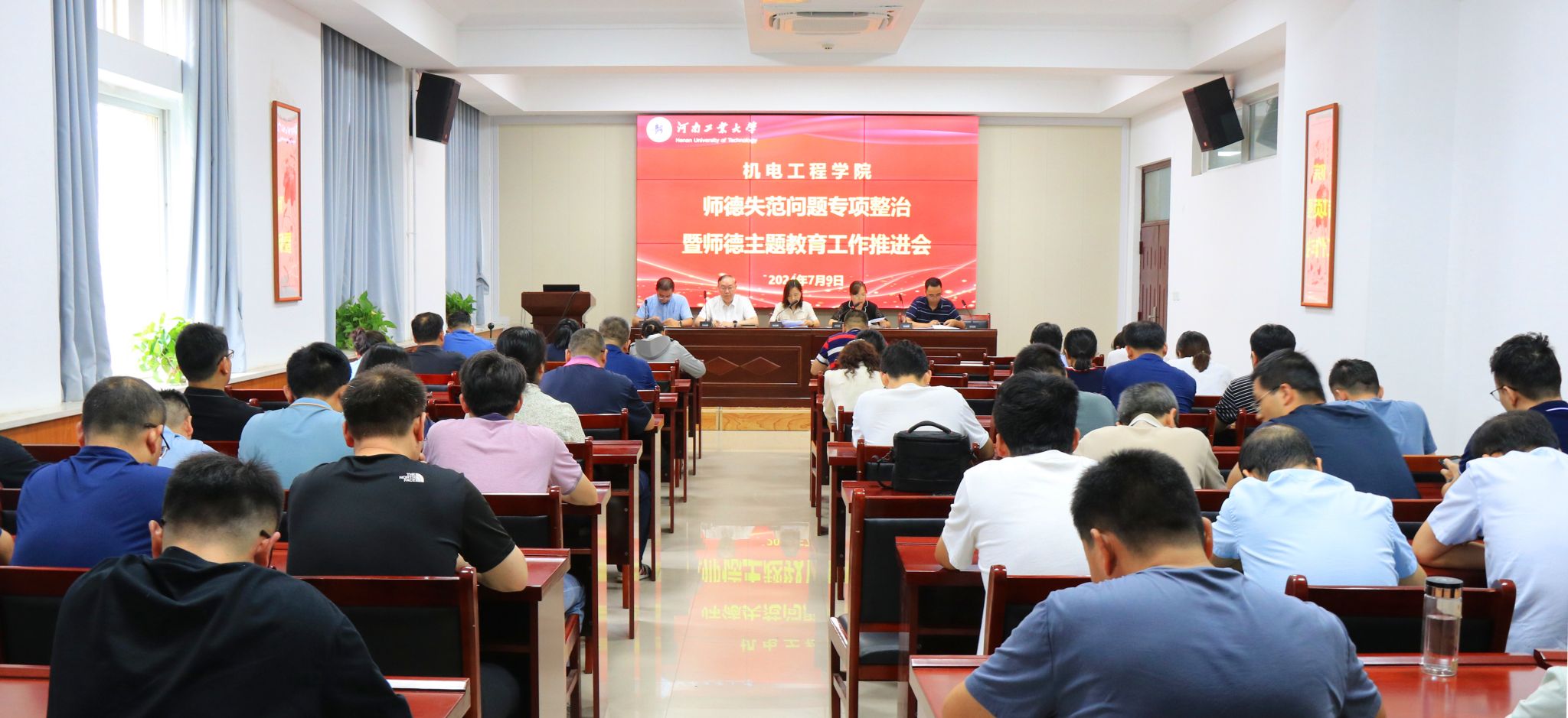 在捷赛厅召开师德失范问题专项整治暨师德主题教育工作推进会。学院全体教工参加会议,会议由学院党委副书记、纪检委员张小彩主持。