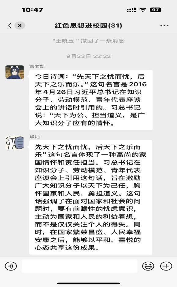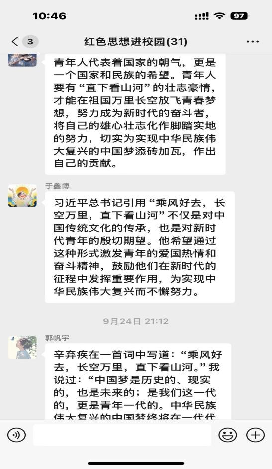 这次的主题活动主要以寻找和鉴赏诗词为主,按照学号的顺序,大家每天依次发送一句习近平总书记在各种大会和汇报中引用的诗词,其他同学在下面根据自己的看法对相关诗词做出鉴赏,大家借此机会拓展了自己的知识储备,增强了对中国传统诗词文化的了解与自信,不仅如此,同学们还通过查找资料了解了这些诗词背后的典故,和习近平总书记引用相关诗句的精妙之处,增加了学生们的爱国热情。评论区气氛热烈,展现了同学们热情澎湃、接续奋斗的昂扬精神风貌,表达了全班同学对未来的向往和建功新时代的信念与决心。