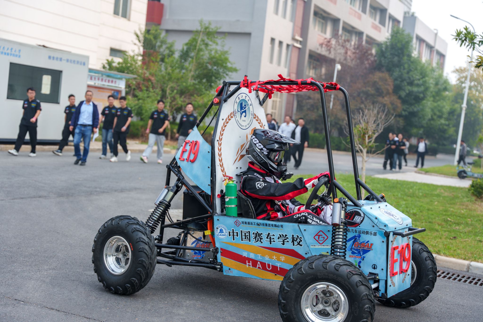 芦宁军、马雁、魏涛、朱红瑜为新车揭幕并授队旗。车队学生驾车全方位展示了车辆的稳定性、通过性等专业性能。