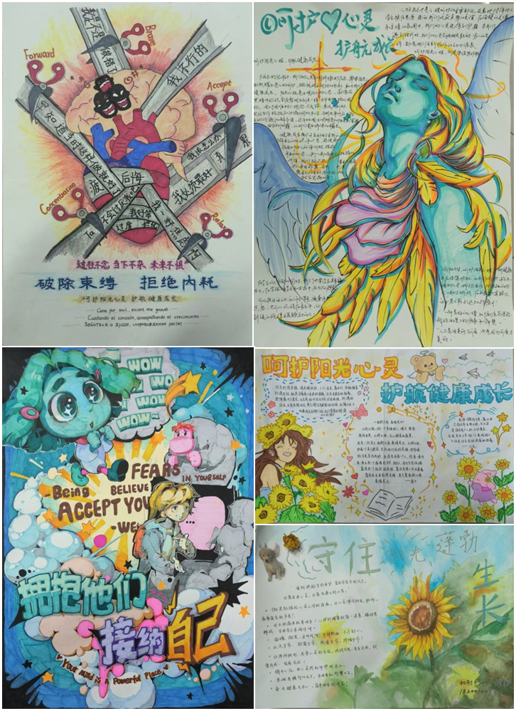 本次活动吸引全校各学院学生参与其中,共收集作品120余幅,各参赛同学以“呵护阳光心灵,护航健康成长”为主题,通过海报、手抄报、绘画、手工DIY创作等多种形式,表达自我,构建内心世界,体现了自己对心理世界的精彩理解。最终,经过评委老师的评选,评出一等奖1名,二等奖3名,三等奖5名,优秀奖若干名。