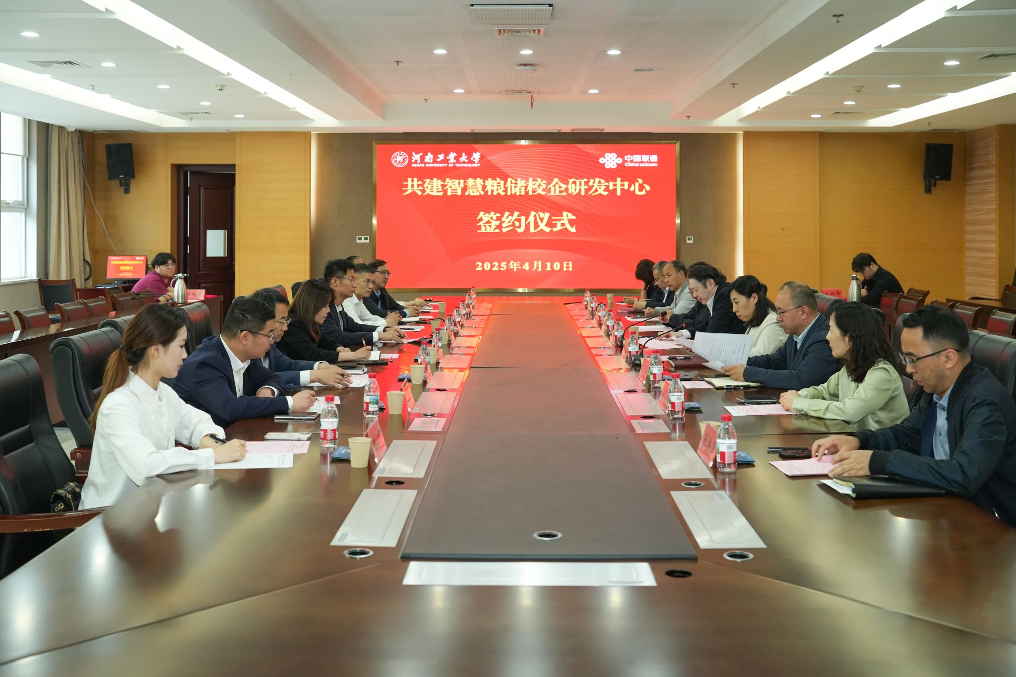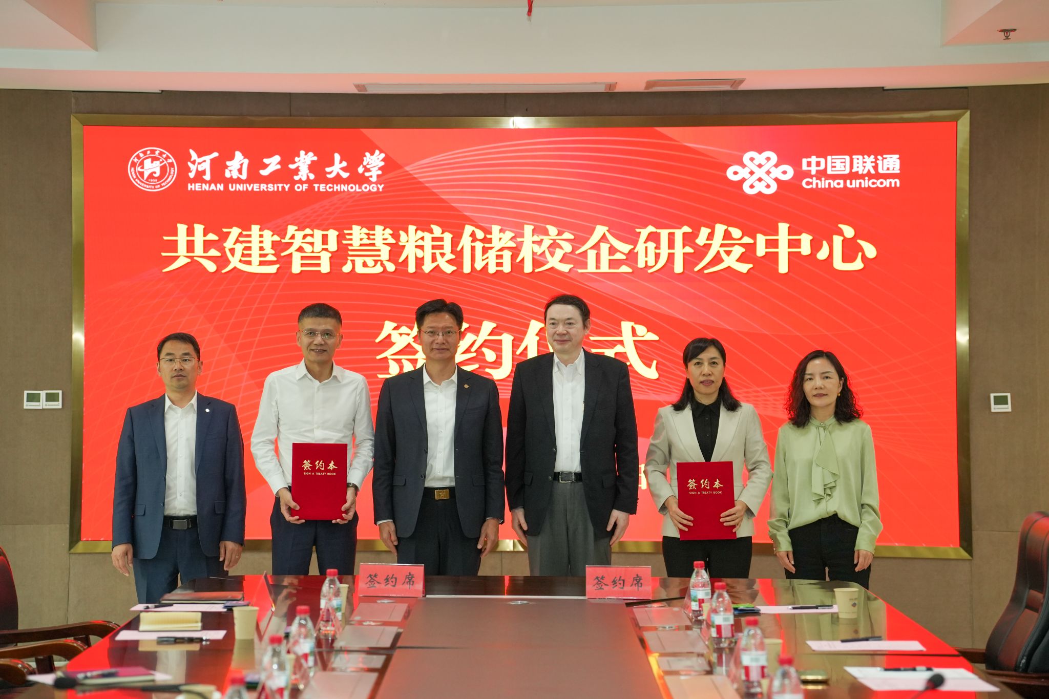 与中国联通郑州市分公司共建“智慧粮储校企研发中心”签约仪式在学术报告中心D203会议室举行。校长吴智深、副校长白艳红,以及校长办公室、科技处、产业技术研究院、信息化办公室、韩国h漫