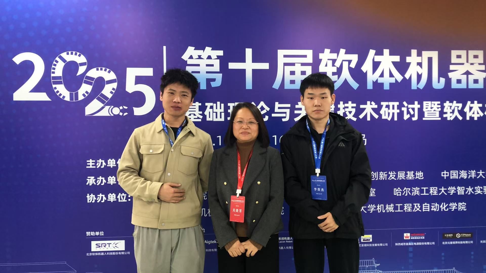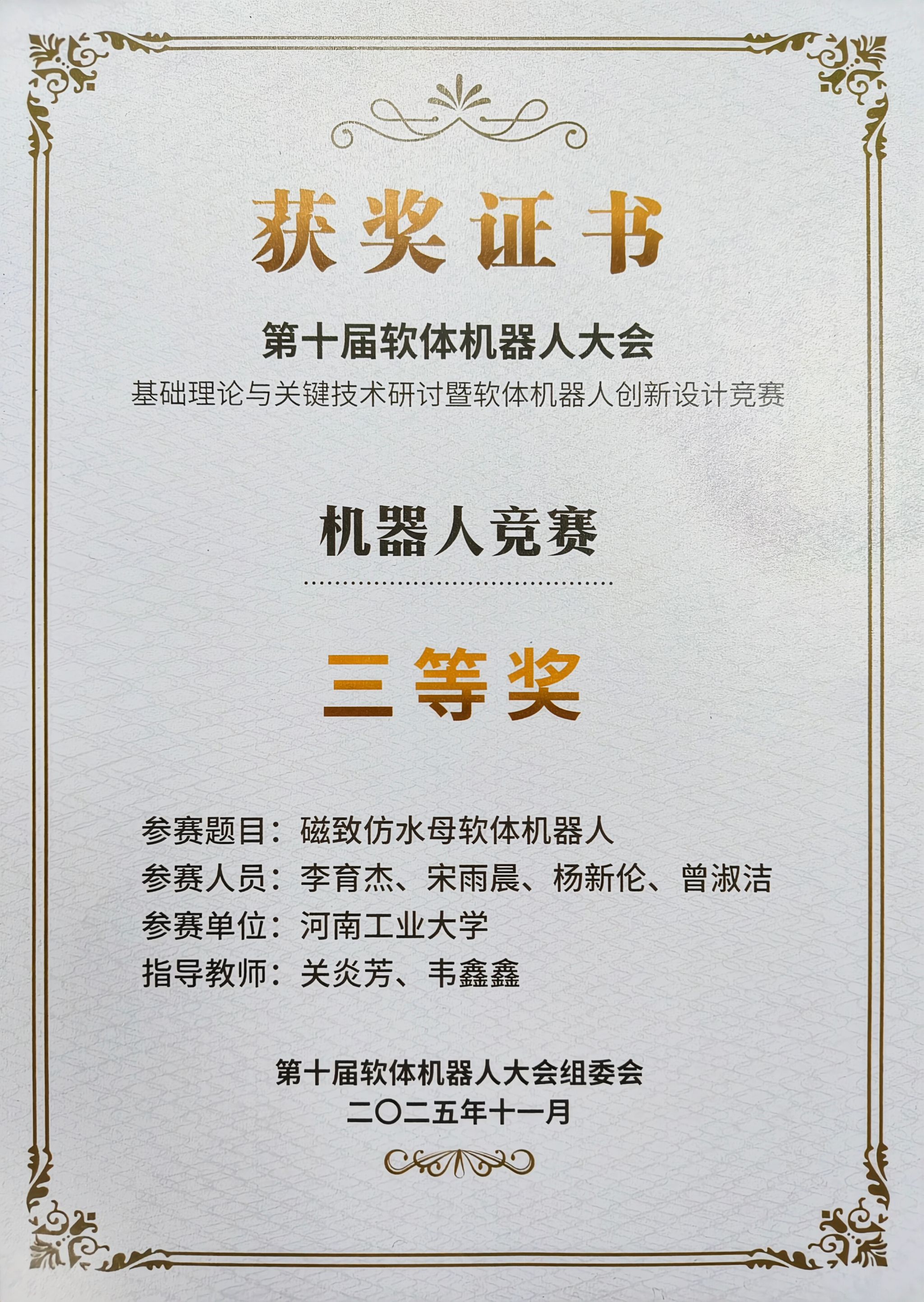 本届大赛赛道设置多样,竞争异常激烈。在海报评比环节中,“智能传感与集成化检测”团队参赛项目“可变形态磁热软体机器人”以其新颖的设计理念、清晰的逻辑架构和直观的成果展示,赢得了评委的高度认可,荣获三等奖。该项目聚焦磁热驱动技术与软体机器人的前沿融合,充分展现了团队在软体机器人驱动方式上的创新探索。在水下软体机器人赛道中,团队带来的“磁致仿水母软体机器人”同样表现优异。该机器人精准模拟了水母高效、灵活的游动特性,在操控稳定性与运动性能方面展现出明显优势。经过多轮水下环境测试,项目最终荣获该赛道第三名的好成绩。