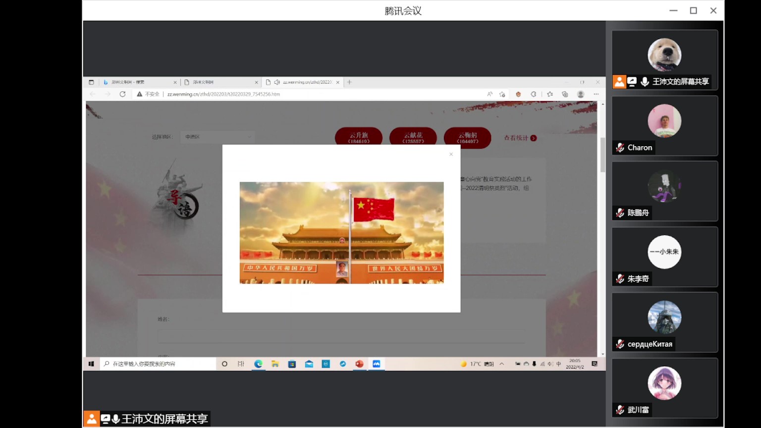 各班级按照学校要求认真组织主题班会,活动内容主要从云升旗、云寄语,普及清明节文化、观看2022年征兵公益宣传片《火热军营 精彩人生》等多个方面来缅怀革命先烈、感悟先烈精神。各班班会以网络平台升国旗,奏国歌拉开帷幕,随后各班团支书从清明节传统节日知识、中国近代革命史等多方面带领同学们重温革命先烈英勇报国的感人事迹。