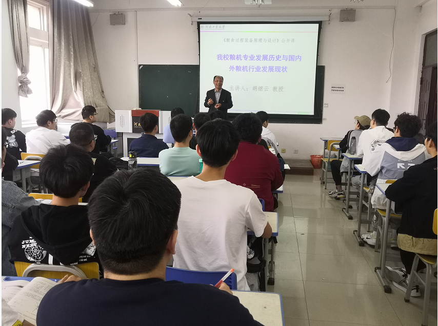胡继云从工程人才培养、学校的发展定位、专业历史沿革的视角向同学们详细介绍了我校粮油机械专业历史和国内外粮机行业发展情况。以自己青年时期求学、留校任教、教学科研等历程,分享了“粮食过程装备原理与设计”课程发展和个人四十年教育生涯的体会。