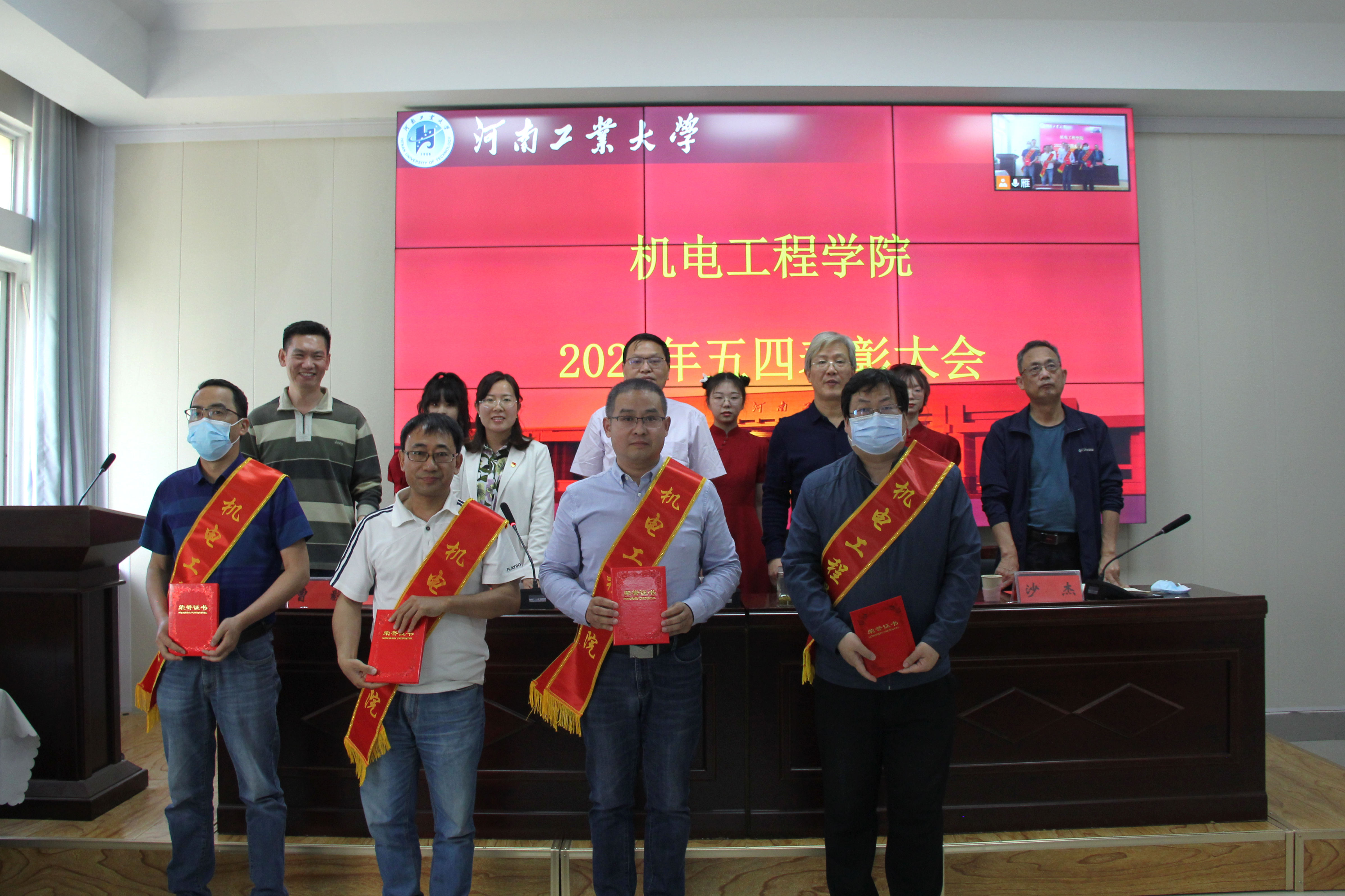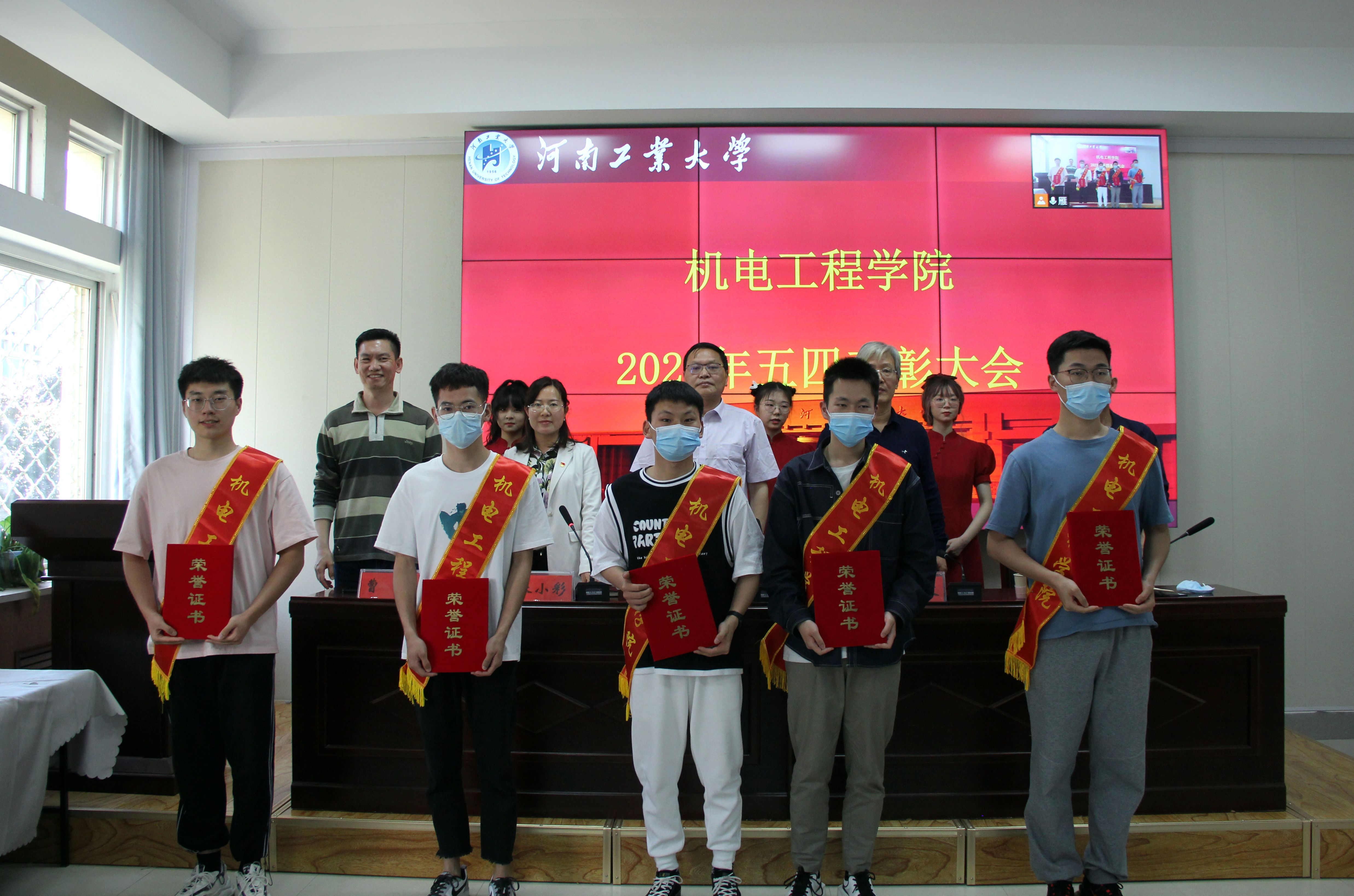 关于表彰2021年度先进集体及先进个人的决定》;副院长沙杰和曹毅分别宣读科技创新优秀指导教师、考研就业优秀指导教师名单。对校先进班集体、五四红旗团支部、十佳优良学风标兵、十佳创新创业标兵、三好学生、优秀学生干部、优秀共青团干部、优秀共青团员及学院科技创新标兵、抗疫情先进个人、学生科技创新优秀指导教师、学生考研就业优秀指导教师等荣誉称号获得者进行表彰。随后,与会领导为受到表彰的先进集体和先进个人颁发奖状并合影留念。