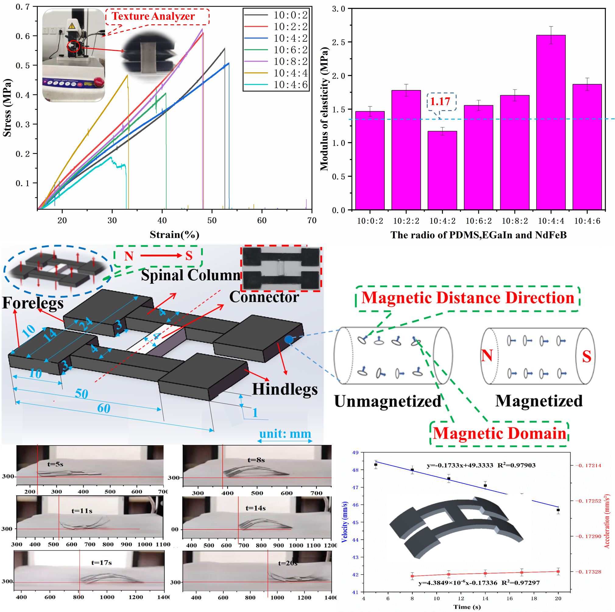 搭建软体机器人磁控实验平台,建立仿尺蠖运动模型,改变磁场方向和大小,以控制尺蠖软体机器人的多自由度形变,通过抗疲劳性能测试以及软体机器人单腿和双腿运动轨迹分析,实现复杂多样化的应用场景。结果表明,EGaIn的添加增强了NdFeB的磁响应度、磁操控性和磁积能,同时提高了仿尺蠖软体机器人的运动速度(48.3mm/s),可靠性和寿命,展现了良好的磁控灵敏度和运动稳定性,为软体机器人发展提供新的思路和方向,有望在军事探测、智能粮仓和生物给药等领域带来新的发展机遇,拓宽软体机器人的应用范围。