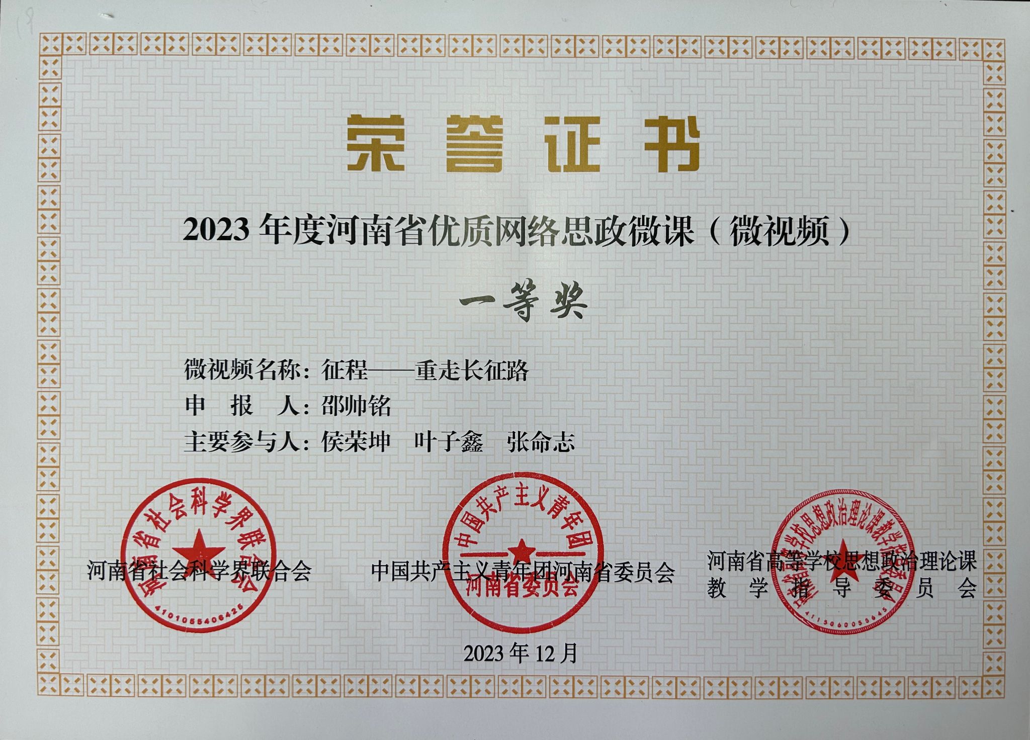 近日,河南省社会科学界联合会公布了2023年度河南省优质网络思政微课(微视频)获奖名单。在此活动中,由韩国h漫 张小彩、丁晶晶老师指导,邵帅铭、侯荣坤、叶子鑫、张命志同学参与创作的《征程——重走长征路》作品荣获省优质网络微视频一等奖。