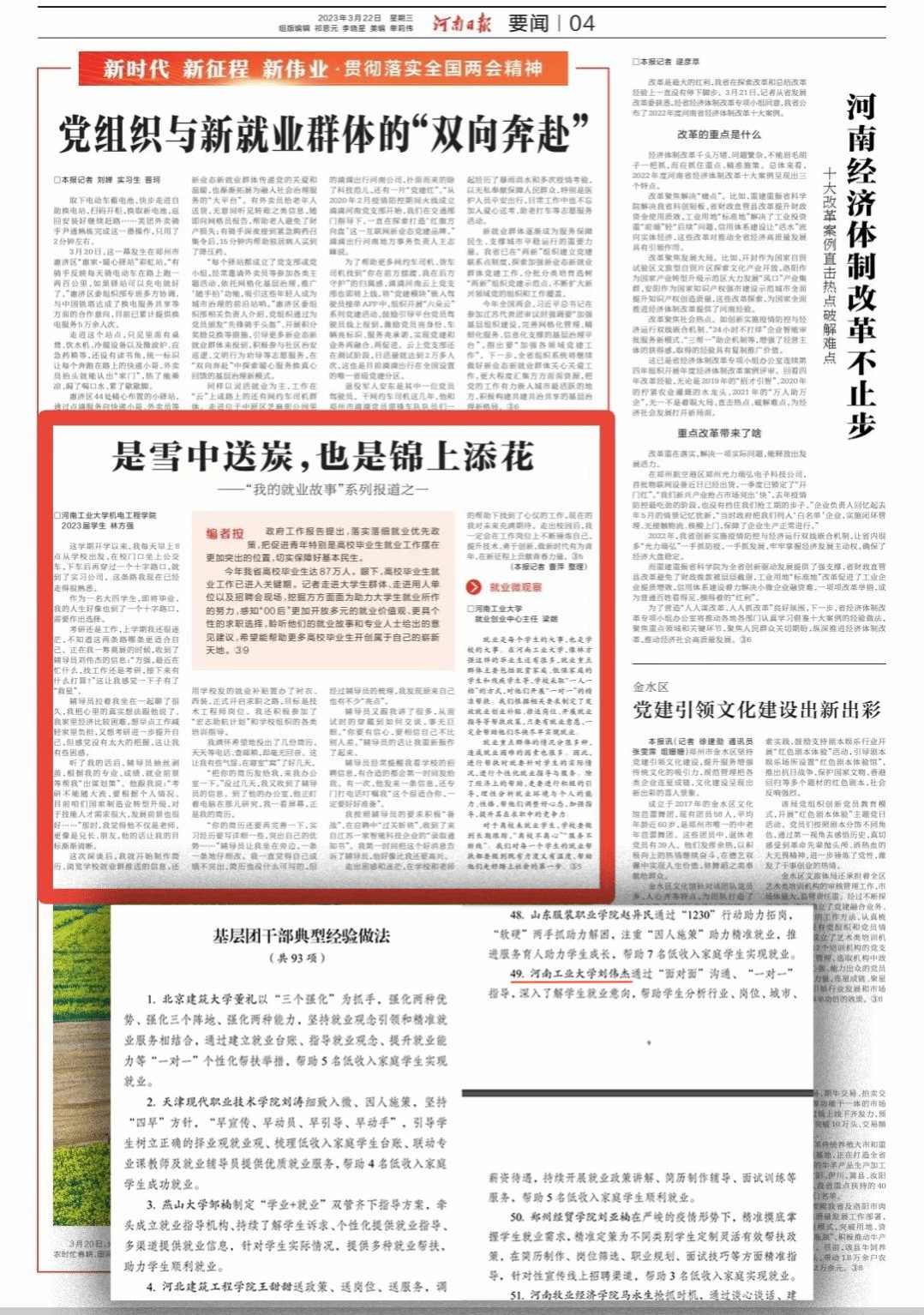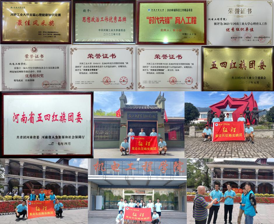 学院牢记为党育人、为国育才使命,全面落实立德树人根本任务,强化“三全育人”体制机制,培养德智体美劳全面发展的社会主义建设者和接班人。近三年来,学生科技创新竞赛成绩斐然,荣获“挑战杯”、“互联网+”综合类赛事国家级奖项6项,省赛30余项,专业类竞赛获省部级以上奖项100余项。学生每年就业率90%以上,毕业生重点群体就业帮扶工作被《河南日报》报道,入选共青团中央“基层团干部典型经验做法”。思想政治教育工作成果丰富,“征程”社会实践团队获得全国优秀社会实践团队,学院荣获全国百佳心理委员提名奖、河南省五四红旗团委、河南省百佳团支部等,“机电先锋”“征程”荣获校“思想政治工作优秀品牌”;学院师生获得河南省优秀党务工作者、河南省优秀高校辅导员、河南省优秀学生干部、河南省文明学生等省级以上荣誉百余项。